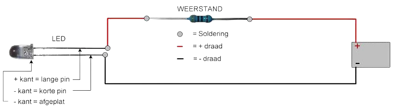 (+ 9V) ---- [ Weerstand ] ----|>|---- ( - )