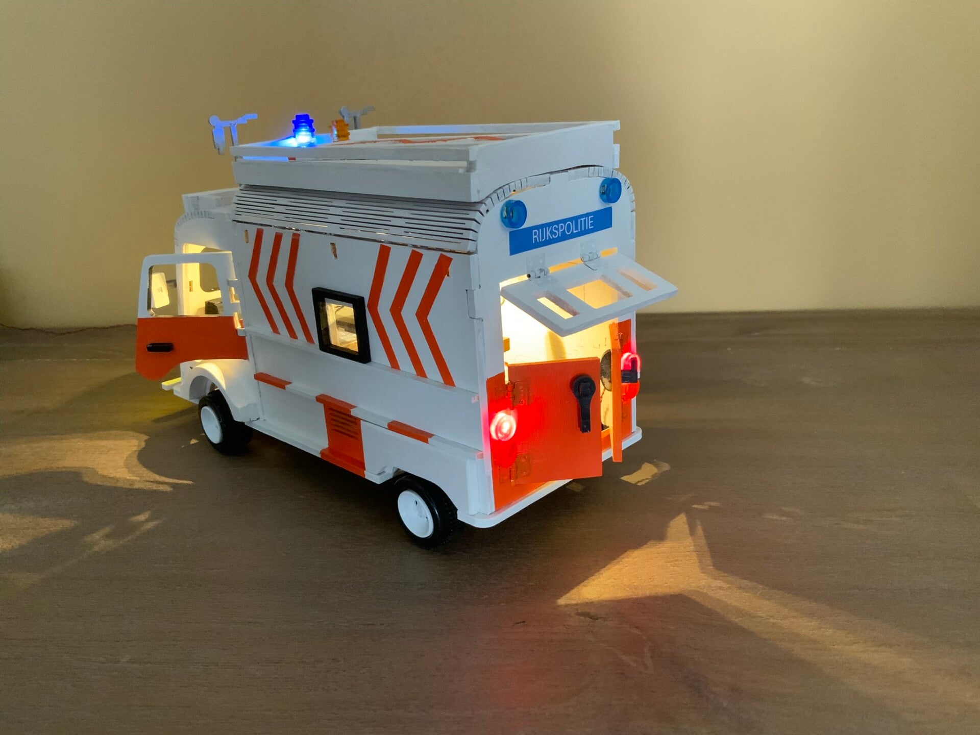 Eindresultaat Hier zie je het afgewerkte model van alle kanten, inclusief close‑ups van de kenmerkende Rijkspolitie‑details.