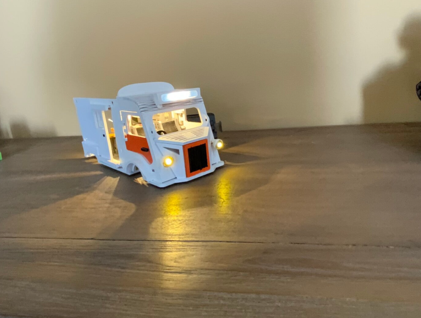 De politie‑specifieke onderdelen, zoals het zwaailicht en de oranje panelen, zijn passend gemaakt en voorbereid voor montage.