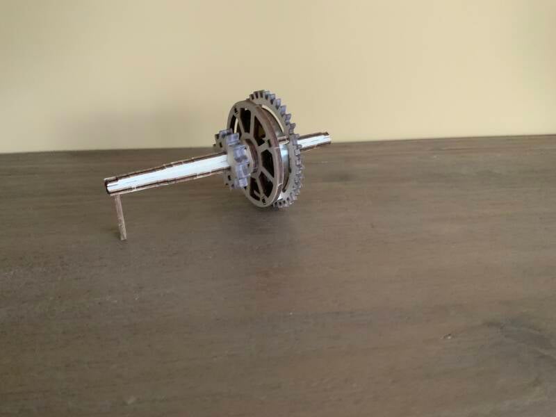De tandwielstructuur wordt verder verstevigd met extra panelen en verbindingsstukken. De overbrenging begint nu echt vorm te krijgen: bij het draaien van de handgreep zie je meerdere assen tegelijk bewegen.